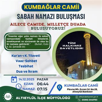 Bu hafta sabah namazı buluşmamız, "Kumbağlar Camii"nde gerçekleştirilecektir.