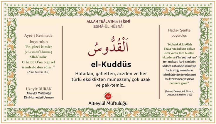 Allah'ın sıfatı olarak "el-Kuddûs"; her türlü çirkinlik, noksanlık ve ayıplardan uzak, tertemiz, bütün kemal sıfatları kendisinde toplayan, güzellik, iyilik ve faziletler le övülen demektir.