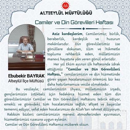 ALTIEYLÜL İLÇE MÜFTÜMÜZ EBUBEKİR BAYRAK'IN CAMİLER VE DİN GÖREVLİLERİ HAFTASI MESAJI