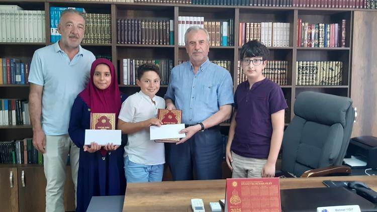 İlçe Müftümüz Mehmet YİĞİT, Sakarya Camii İmam-Hatibi Rahmi AYGÜN ile beraber müftülük makamına ziyarete gelen öğrencilere hediyeler takdim etti.
