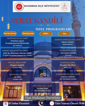 Bandırma İlçe Müftülüğümüz koordinesinde düzenlenecek olan Berat Kandili Özel Programları, Kur’an-ı Kerim tilaveti, ilahiler ve dualarla gönüllerimize huzur katacaktır.
