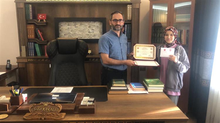 İlçemiz Çamdibi Mah. Kur'an Kursunda hafızlığını tamamlayarak 2025 yılı II. Dönem hafızlık sınavında başarılı olarak mezun olan Fatma GÜVENÇ'e Diyanet İşleri Başkanlımız Eğitim Hizmetleri Genel Müdürlüğü tarafından gönderilen "Hafızlık İcazetnamesi ve Teşekkür Belgesi" belgesi İlçe Müftüsü Sedat KARALİ tarafından takdim edildi.