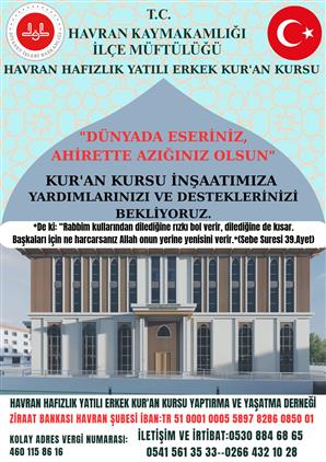 Havran Hafızlık Yatılı Erkek Kuran Kursu İnşaatımız proje aşamasını tamamlamış olup, yakın zamanda inşaat çalışmalarına başlayacaktır. söz konusu kursun inşaat çalışmalarına maddi destek sağlamak isteyen vatandaşlarımız paylaşılan afiş'teki hesap numarasına bağış yapabilecektir. Kurs ile ilgili ayrıntılı bilgi için Müftülüğümüze başvurabilirsiniz.