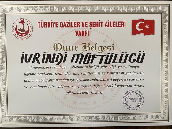 Türkiye Gaziler ve Şehit Aileleri Vakfı tarafından İvrindi İlçe Müftülüğümüzün "Onur Belgesi" ile taltif edilmesi de İvrindi İlçe Müftülüğümüz için büyük bir onur ve gururdur. Allah Devletimizi ve milletimizi var eylesin.