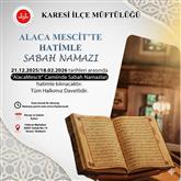HATİMLE SABAH NAMAZI YARIN BAŞLIYOR 20.12.2025 21 Aralık 2025 Pazar günü Alacamescit Camii'nde başlayacak olan Hatimle Sabah Namazı'na kadın-erkek tüm cemaatimizi bekliyoruz. Detay