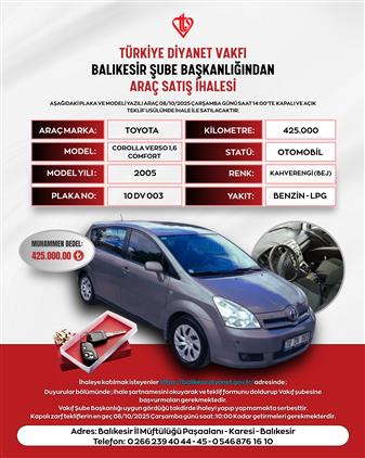TÜRKİYE DİYANET VAKFI BALIKESİR ŞUBE BAŞKANLIĞINDAN ARAÇ SATIŞ İHALESİ