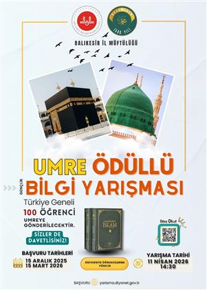 Üniversiteli gençlerimizle yönelik düzenlenen Gençlik Bilgi Yarışmasında Türkiye genelinde dereceye giren ilk 100 öğrenci Başkanlığımız tarafından umre ile ödüllendirilecek; ayrıca müftülükler derece elde eden diğer öğrencileri imkânları nispetinde ödüllendirilebilecektir.